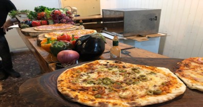 פיצות הנאפות על אבן שמות במקום עם גבינה צהובה עמק, רוטב פיצה ותוספות: זיתים ירוקים ושחורים, עגבנייה, בצל, תירס ופטריות.