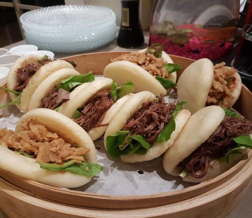 גיוזות ודים סאם מאודים במילויים עוף, פטריות, בטטה וירקות הגשה בסירות במבוק במגוון רטבים